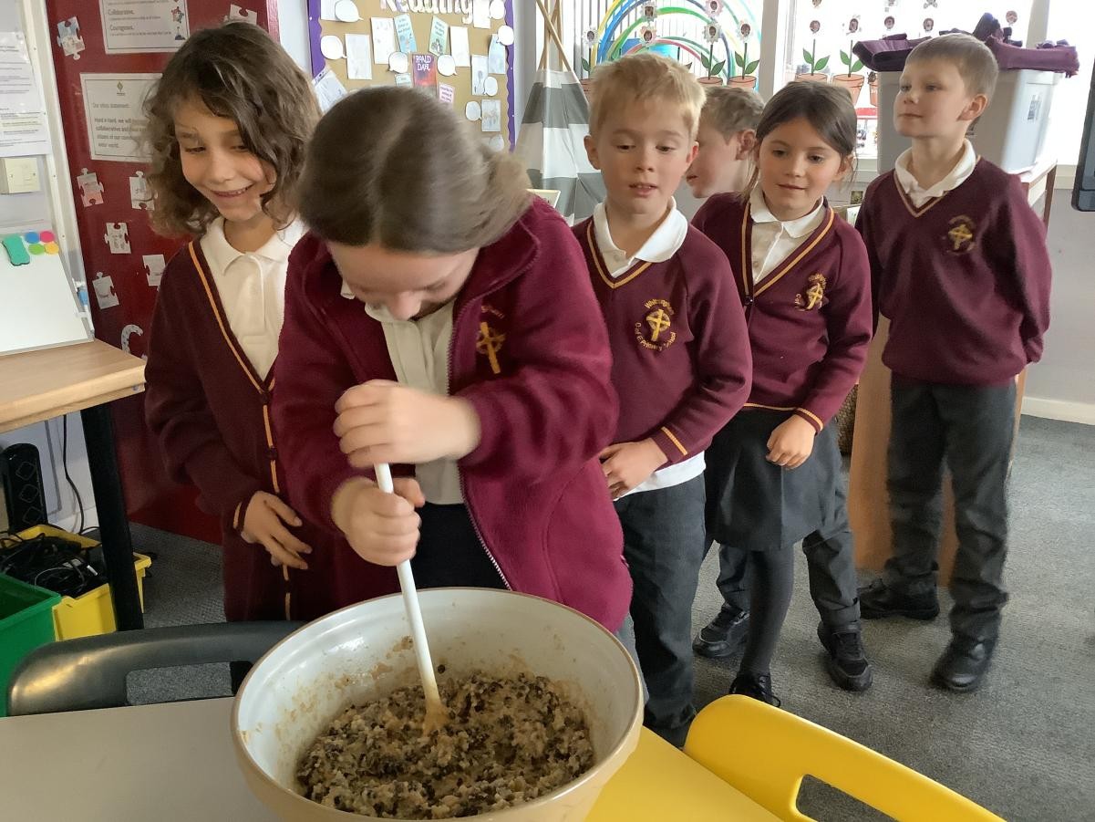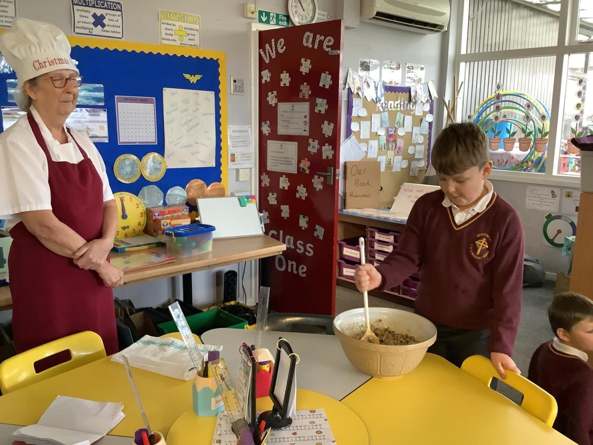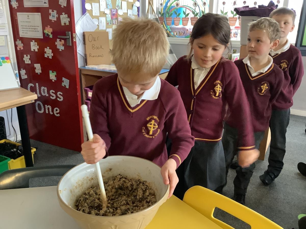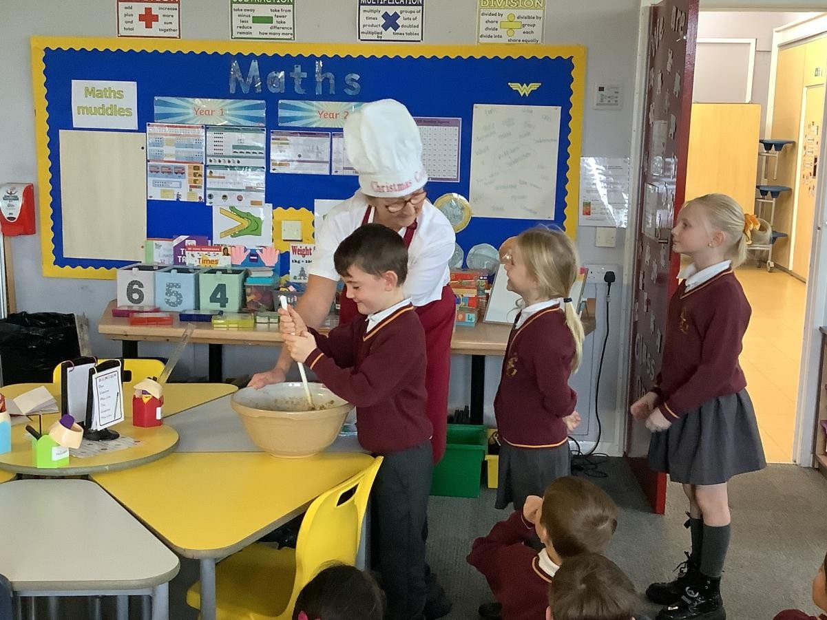 Mrs Arkle was making our Christmas Puddings in preparation for our Christmas dinner before we break up for the Christmas holidays. As our tradition, we added our own wishes to the pudding mixture and sang the Christmas pudding song.