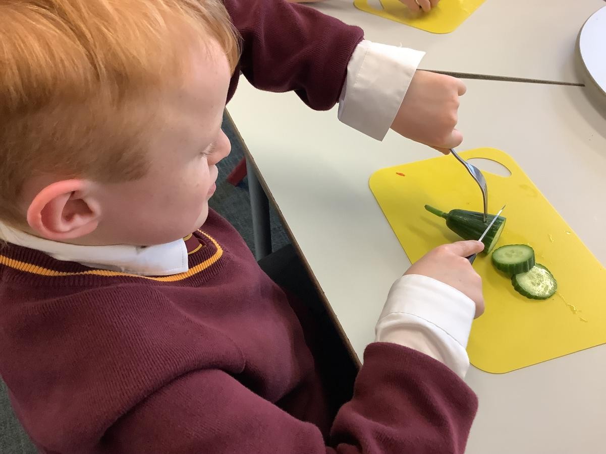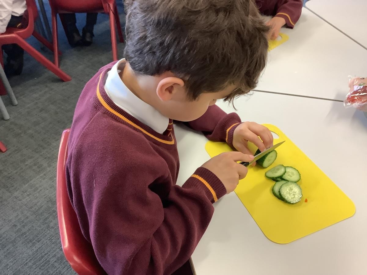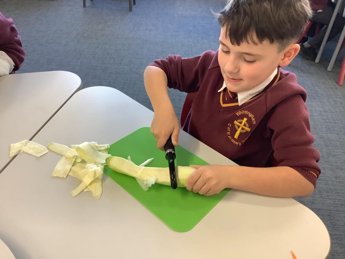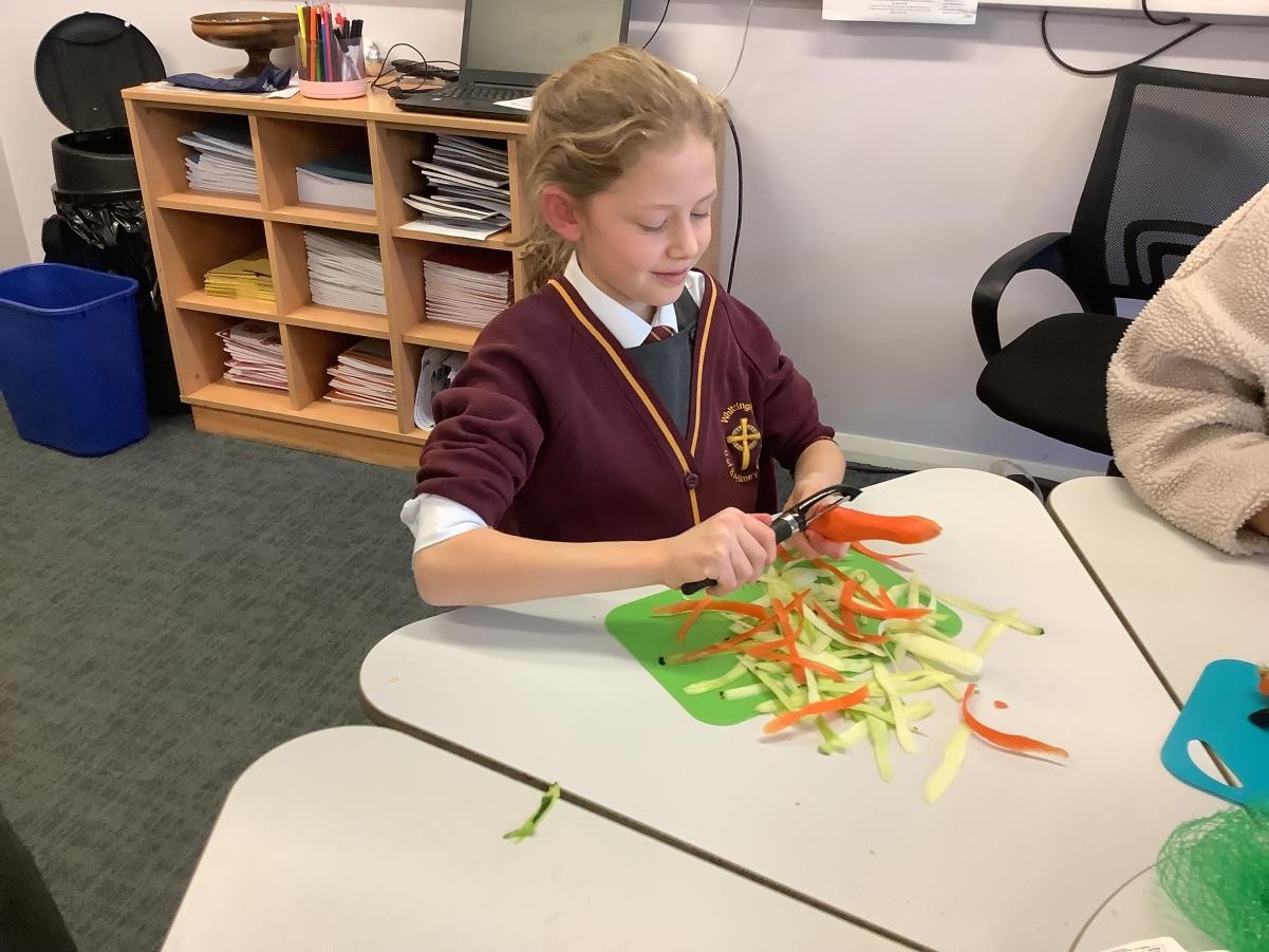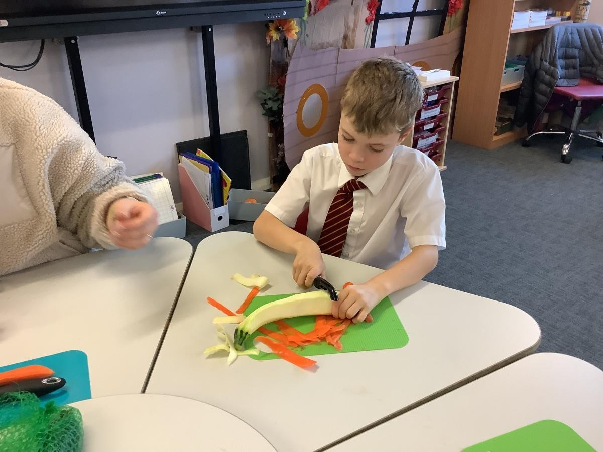 In our DT lessons we are thinking about eating seasonal food and we will be making a seasonal vegetable tart. Today we learned how to peel and cut different vegetables safely, we used the claw grip and the bridge hold. We also learned to peel away from our body.