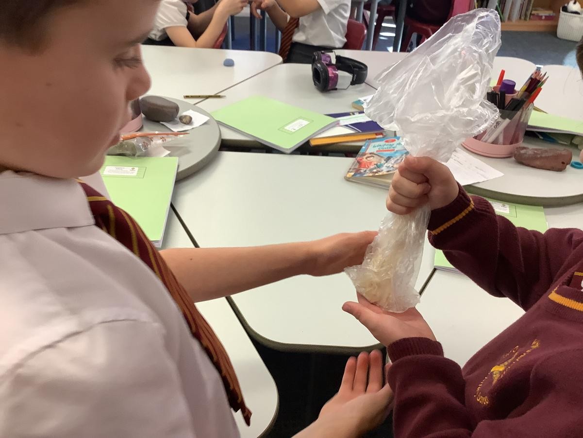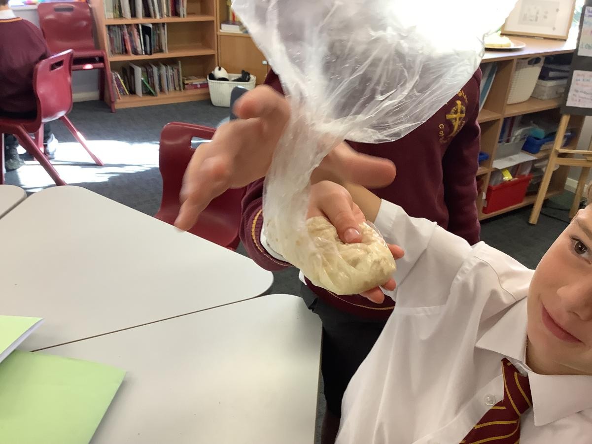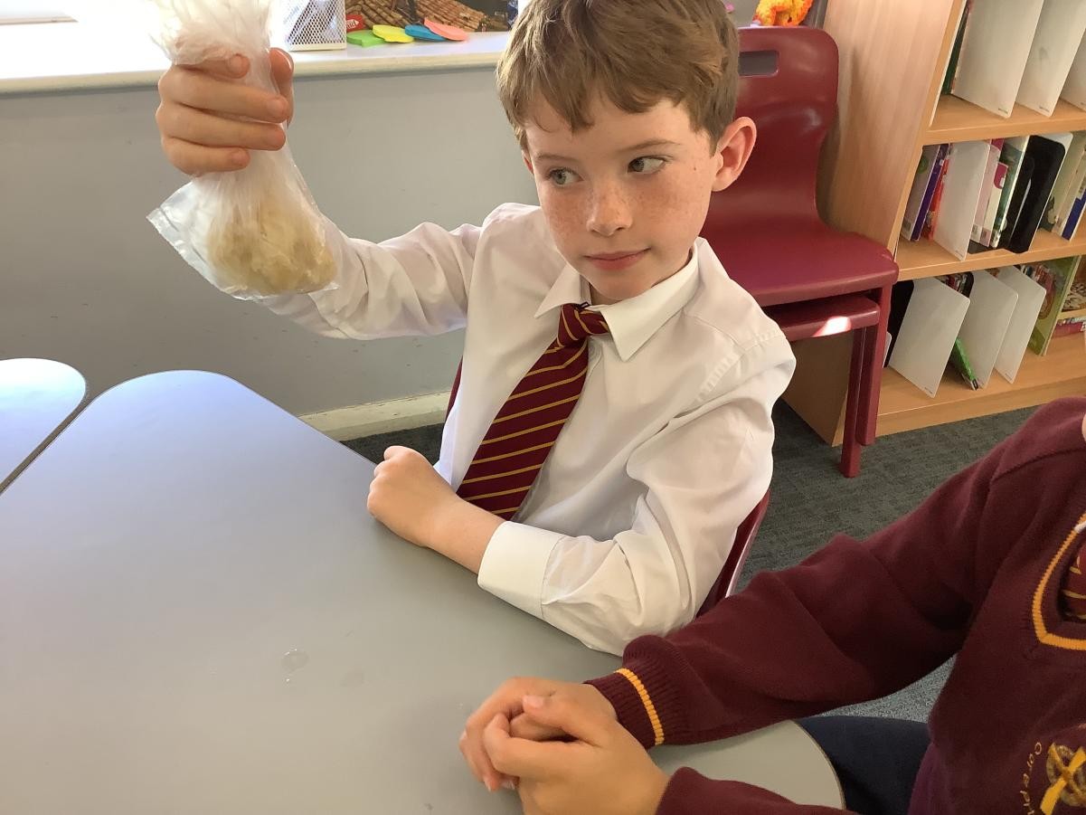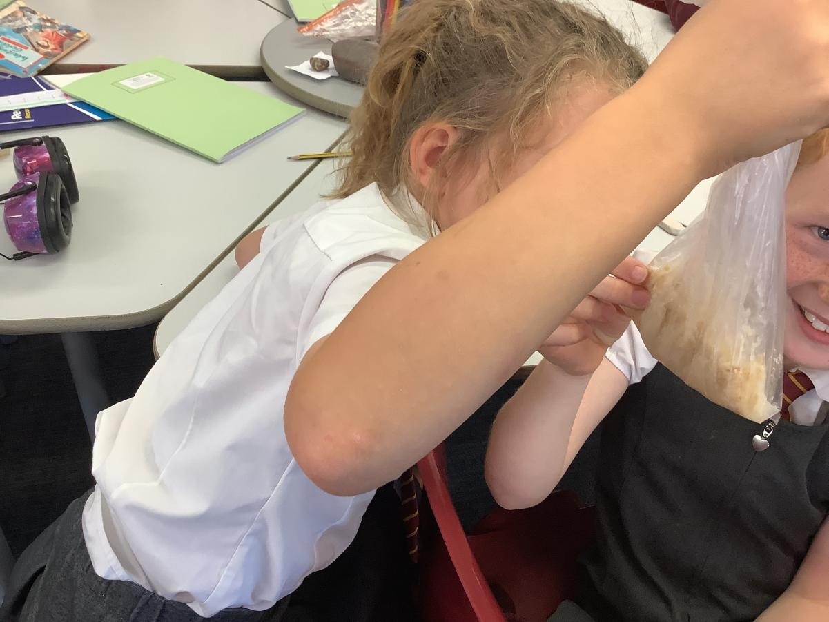 In our science lesson this week we investigated what happens to the food we eat when it gets to our stomach. We put a cracker into a bag which represented our stomach then we crushed the cracker up before adding some soda water (stomach acids). It didn’t take long for the cracker to turn into a pulp. We know that after this it travels into the small and then the large intestine. On this journey our bodies absorb all the goodness from the food into our blood stream.