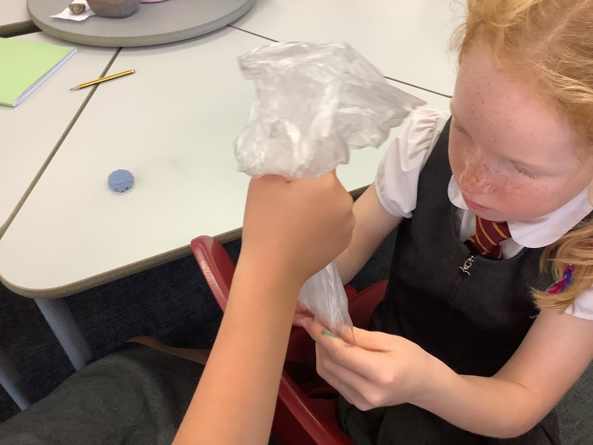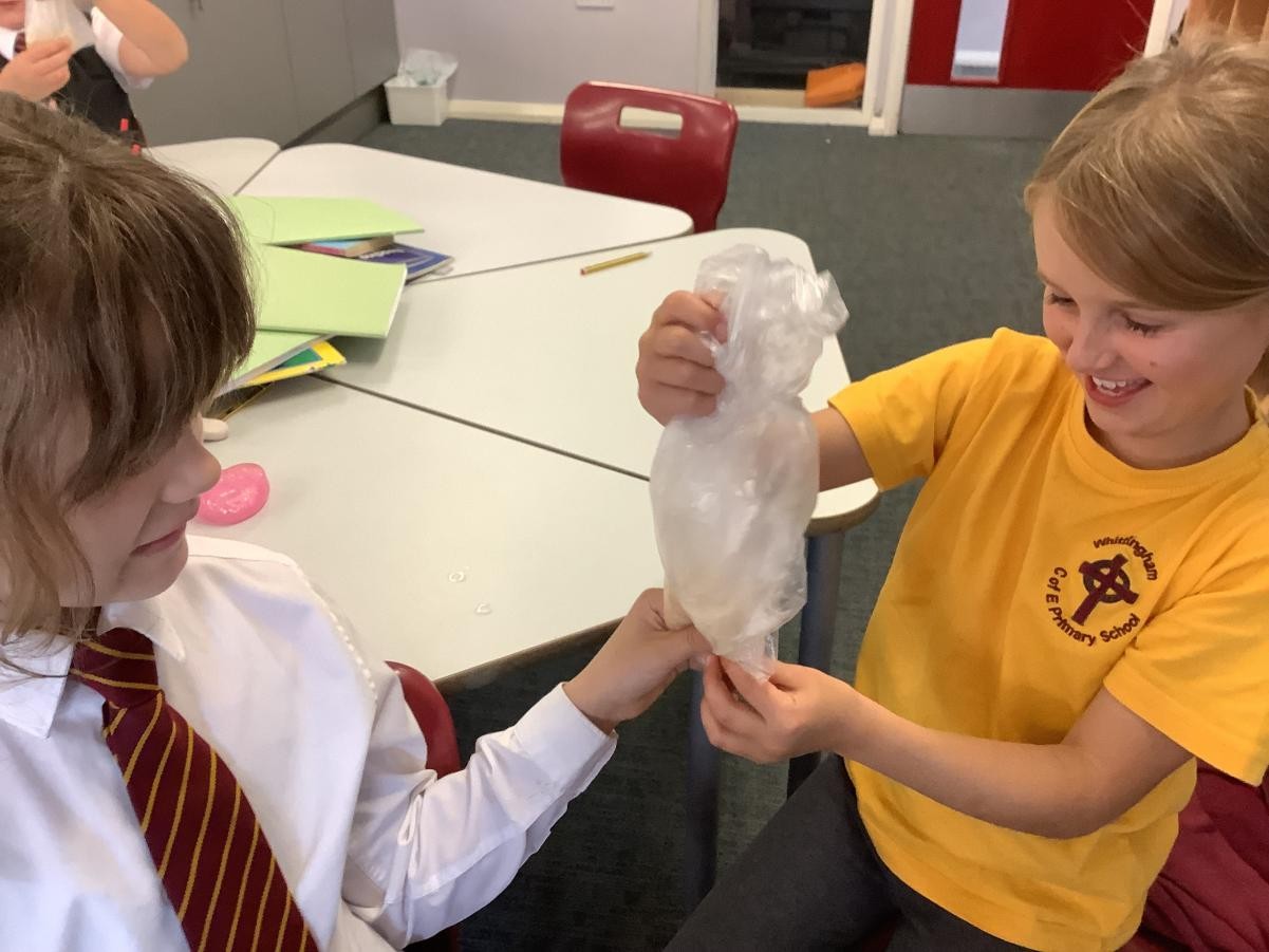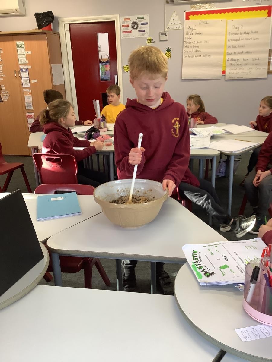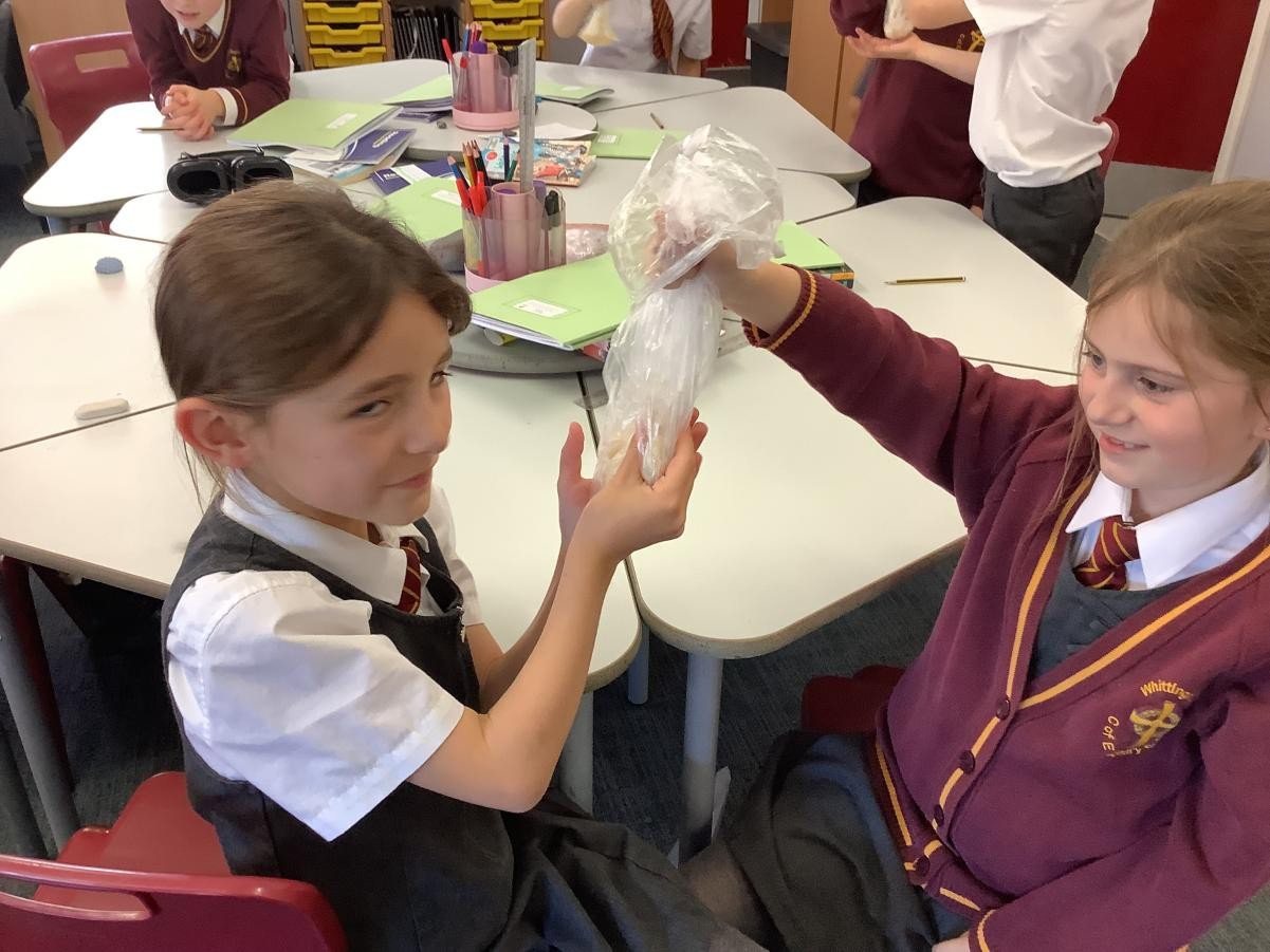 In our science lesson this week we investigated what happens to the food we eat when it gets to our stomach. We put a cracker into a bag which represented our stomach then we crushed the cracker up before adding some soda water (stomach acids). It didn’t take long for the cracker to turn into a pulp. We know that after this it travels into the small and then the large intestine. On this journey our bodies absorb all the goodness from the food into our blood stream.